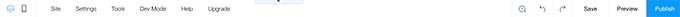 Di bagian atas halaman, Kamu akan memiliki menu utama. Kamu menggunakannya untuk menavigasi ke websitemu, beralih antara tampilan desktop dan seluler, mengakses tools kamu, pengaturan dan mode dev, melihat pratinjau dan mempublikasikan setiap perubahan yang Kamu buat ke situs.
